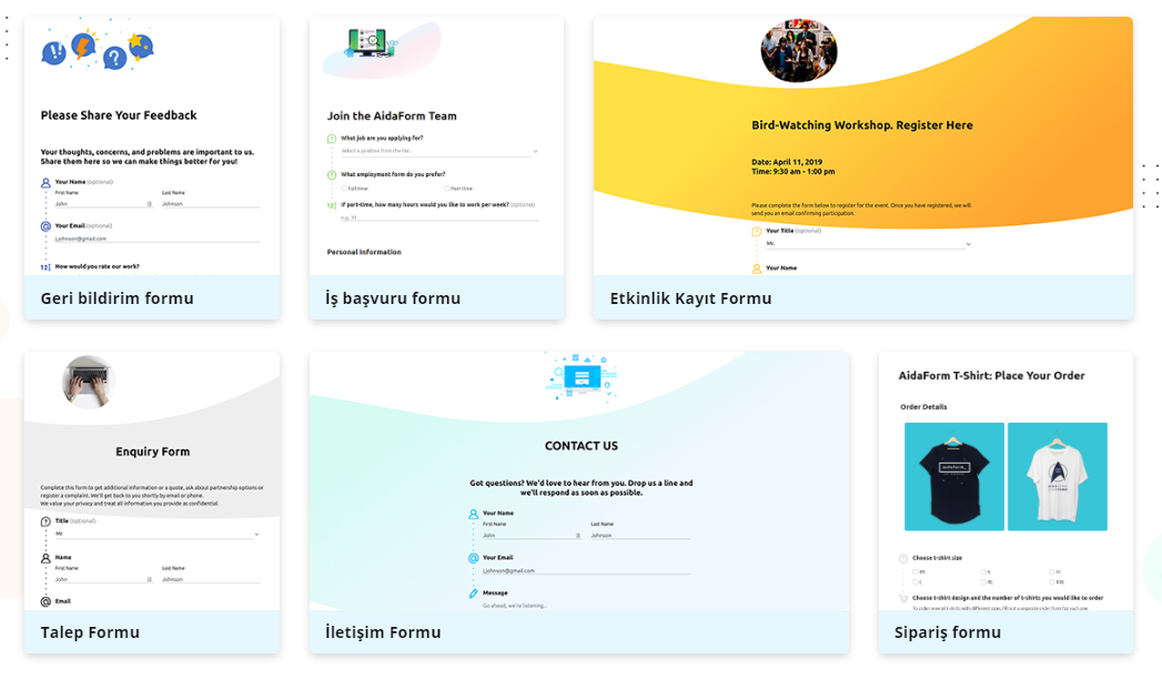 https://aidaform.com/ adresine girip 10 saniye de üyelik oluşturun. Yukarı da yer alan resimde de görüldüğü üzere sitede hali hazırda bulunan “Geri Bildirim Formu” , “İş Başvuru Formu“, “Sipariş Formu” , “Etkinlik Formu” gibi gibi gibi bir çok konu üzerine hazır formlar bulunmakta. üyelik işleminden sonra istediğiniz tasarımı ve formu ücretsiz kullanabiliyorsunuz. Değiştirmesi ve ayarlaması gerçekten çok basit seviyede.