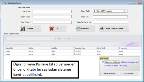 Program Hakkında Kısa Bilgi: Basit seviyede giriş ekranına (login ekranı) sahip, sisteme kayıt edilebilen öğrenci / kişi sayfası ve sonrasında sisteme kayıtlı öğrencilere “Verilen Kitaplar” veya “Geri Gelen Kitaplar” sayfasından güncelleme işlemi yapabilir bu sayede tüm kitapların kontrolünü sağlayabilirsiniz.. Bunların yanında ek olarak proje içerisinde “Etkinlik-Takvim-Ajanda” oluşturabileceğiniz bir sayfa, ek olarak istatistiklerin tutulduğu bir sayfa ve son olarak klasik bir “Hakkında” sayfası mevcuttur.