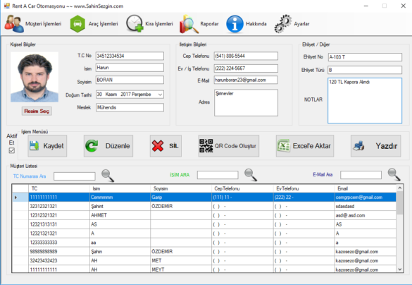 2- Müşteri İşlemleri: Müşterinin Kişisel bilgileri, iletişim bilgileri, ehliyet ve kimlik bilgilerini müşteri fotoğrafı ile beraber detaylı bir şekilde kayıt edebilirsiniz. Kayıt edilen her müşteriyi düzenleyebilir, silebilir, mail gönderebilir, tüm müşteri listesini excel’e aktarabilir, yazdırabilir veya qrCode oluşturabilirsiniz.