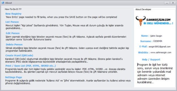 Bireysel veya Kurumsal olarak kullanılabilecek orta seviye fakat gelişmiş özellikleri ve pratik kullanımı ile sizlere sunduğumuz Gelişmiş Fihrist Kayıt programı.. Kişi bilgileri, iletişim adresleri ve tüm detaylarını kayıt edebileceğiniz, kayıt edilen tüm verileri toplu veya tek tek Yazdırma işlemi yapabileceğiniz bunun dışında dilediğiniz kişinin Vcard (QRCode) kodunu oluştururak akıllı telefonlarınıza kişileri QRCODE ile tüm bilgilerini eksiksiz aktarabilirsiniz…Klasik fihrist programlarının yanı sıra 3 adet dil seçeneği ve gelişmiş özellikleriyle dikkat çekmekte.. Üniversite ders projesi olarak teslim edilmiş ve 100 üzerinden 94 ile değerlendirilmiştir..